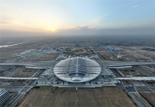 京雄城际铁路雄安站(2024年3月29日摄,无人机照片)。从空中俯瞰,形似“青莲滴露”的雄安站,就像荷叶上的一滴露珠,车站站房椭圆形屋顶是一座光伏电站,铺设了4.2万平方米光伏板,年均发电量约为580万千瓦时。