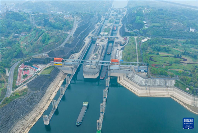 4月4日,船舶有序通过三峡双线五级船闸(无人机照片)。