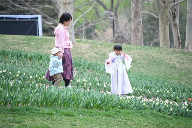 4月4日,游客在北京世界花卉大观园游览。新华社记者 任超 摄