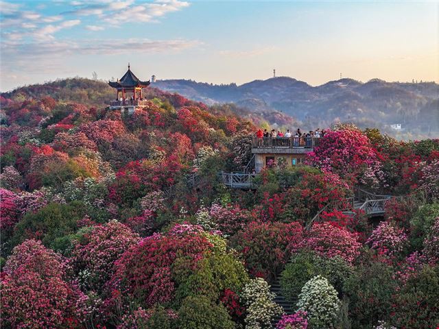 贵州乌蒙山区,百里杜鹃景区的野生杜鹃花相继绽放,如同一条彩带飘舞山间,这里有面积大、种类多、保存完好的原始杜鹃林。景区管理单位举行了祭花神等丰富的民俗活动。