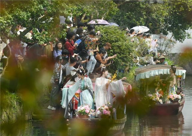 3月24日,“花神”乘坐花船在西溪湿地巡游。当日,杭州西溪湿地一年一度的花朝节开启,十二花神花船巡游、古戏台花神迎春等仪式向游客展示花朝节的传统习俗,展现江南春日浪漫。新华社记者 翁忻旸 摄