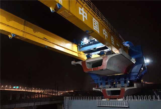 这是2024年3月4日凌晨拍摄的沪苏湖铁路全线最后一榀箱梁架设施工现场。当日,沪苏湖铁路全线箱梁架设完成。