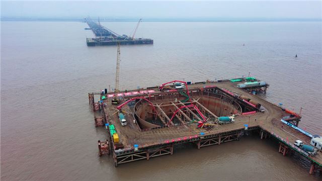 2024年3月27日,在江苏启东长江入海口北支航道江面施工现场,上海至南京至合肥高铁控制性节点工程——崇启公铁长江大桥3、4号主墩承台首次浇筑完成。