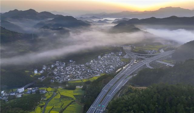 这是2024年3月20日拍摄的位于安徽省黄山市歙县的黄千高速公路。黄千高速公路依山傍水,是连接安徽黄山和浙江千岛湖两大景区的旅游快速干线(无人机照片)。