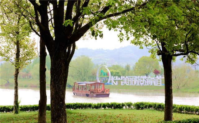 2024年4月10日,游船在浙江省湖州市长兴县太湖图影湿地的航道上航行。