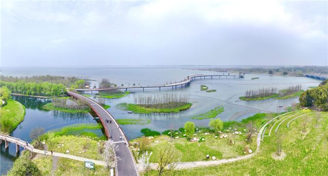 这是连接上海青浦和江苏吴江两地的元荡慢行桥(2024年3月31日摄,无人机照片)。漫步桥上,大好风光尽收眼底。同心结形状的元荡慢行桥,是长三角一体化发展的生动注脚之一。