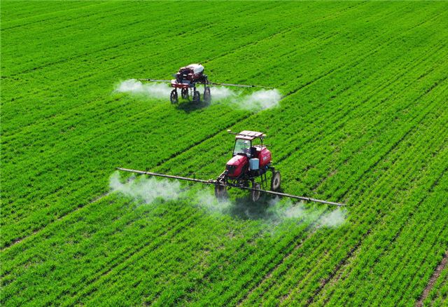 2024年3月13日,在安徽省蚌埠市五河县头铺镇,农民驾驶农机给小麦喷洒农药。新华社记者 黄博涵 摄