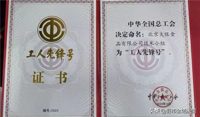 2022年9月在旺旺集团生产研发群组织的技能大比武中,北京技术小组表现出色,成绩优异,即被集团评为“道技之星、巧技之星、精技之星”,而小组整体表现优异,亦被公司评为“优秀班组”。一切努力在2024年4月底五一国际劳动节前夕“开花结果”,由北京大旺食品有限公司技术小组荣获『全国工人先锋号』的荣誉称号。