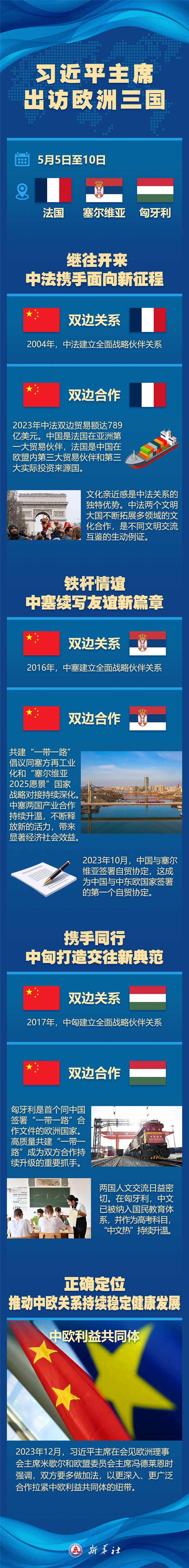 应法兰西共和国总统马克龙、塞尔维亚共和国总统武契奇、匈牙利总统舒尤克和总理欧尔班邀请,国家主席习近平将于5月5日至10日对上述三国进行国事访问。访问期间,习近平主席将同法国、塞尔维亚、匈牙利领导人为双边关系、中欧关系健康发展指引方向,为拓展深化互利合作注入动力。一起来看