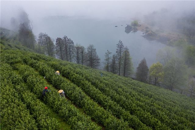 2024年4月7日,在位于浙江省金华市金华山鹿田村的婺州举岩茶基地,茶农在采摘举岩茶鲜叶,发展特色茶产业是推动当地百姓共富的重要途径之一(无人机照片)。新华社记者 徐昱 摄