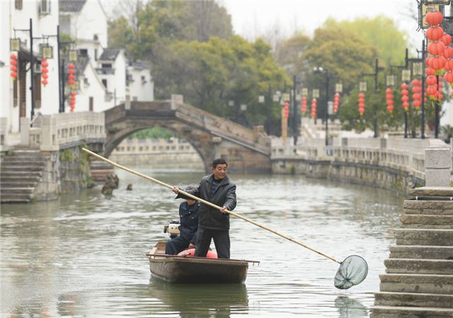 2023年3月16日,在太湖畔的浙江省湖州市织里镇义皋村,保洁员在清理河道。多年来的溇港整治使得太湖周边河道水质明显改善,也为乡村旅游注入动力。新华社记者 翁忻旸 摄