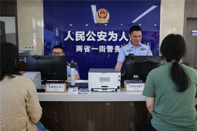 2023年6月2日,安徽的辅警(左二)和江苏的民警(右二)在丹阳警务室政务服务窗口为人们办理业务。安徽马鞍山博望区丹阳镇与江苏南京江宁区丹阳社区相毗邻,2023年年2月底,苏皖“两省一街”丹阳警务室政务服务窗口正式揭牌,在两地交界区域实体化运行。新华社记者 杜潇逸 摄