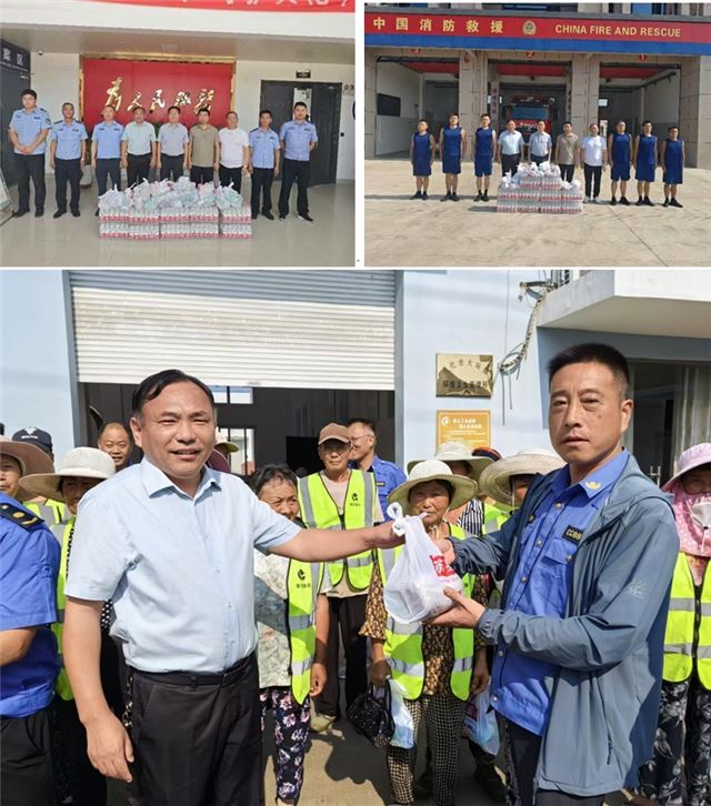 王高监等镇领导一行先后前往镇环卫所、专职消防站、派出所、农路办、城管队等,慰问奋战在一线的辛勤劳动者,为他们送上矿泉水、香皂、洗发水、风油精、毛巾等防暑降温慰问品。