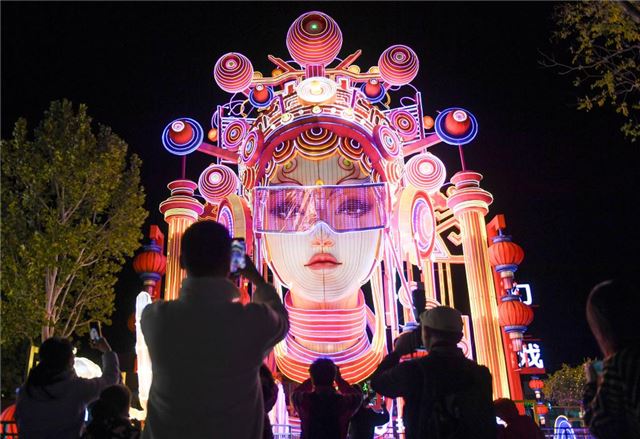 2024年10月1日,游客在“2024北京中秋国庆彩灯游园会”拍照、赏灯。新华社记者 陈钟昊 摄