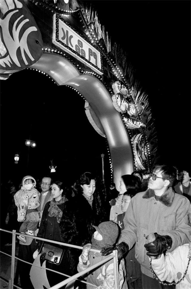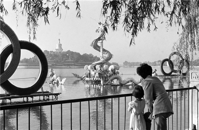 1988年5月28日,游人在北京北海公园观看巨型龙灯。新华社记者 张瑞琪 摄
