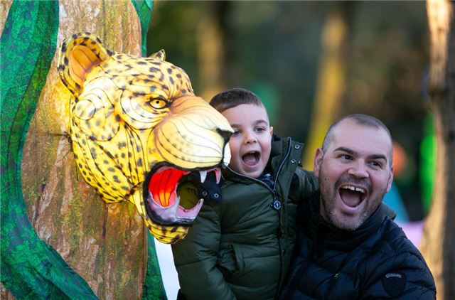 2024年1月28日,在意大利卡西诺,人们在“童话森林”主题公园彩灯节上拍照留念。三百余盏由中国四川自贡手工艺人制作的彩灯在覆盖面积11万平方米、长约2.5公里的游览路径上点亮。新华社记者 李京 摄