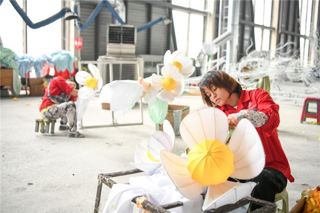2024年9月14日,在自贡海天文化彩灯制作车间,工作人员正在装裱彩灯。新华社记者 唐文豪 摄