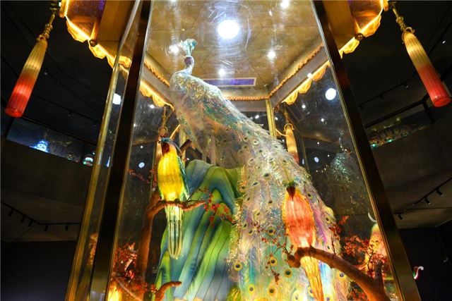 2024年9月14日在自贡市中国彩灯博物馆拍摄的灯组“雀之灵”。这只5.5米高的孔雀彩灯,羽毛由幻彩亚克力制作,一片羽毛要剪2000刀,全身羽毛要剪上千万刀。新华社记者 唐文豪 摄