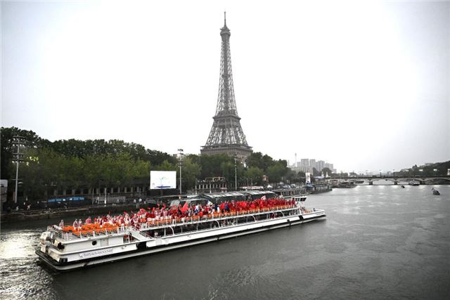 7月26日,中国体育代表团乘坐的船只行驶在塞纳河上,远处是埃菲尔铁塔。新华社记者 李安 摄