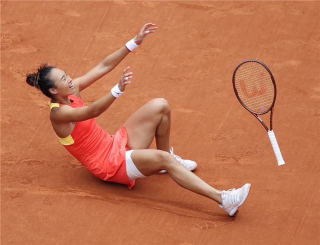 中国选手郑钦文在巴黎奥运会网球女子单打金牌赛后庆祝夺冠(2024年8月3日摄)。新华社记者 高静 摄