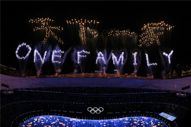 在北京第二十四届冬季奥林匹克运动会闭幕式上,“鸟巢”上空的焰火显示出中文“天下一家”和英文“ONE FAMILY”字样(2022年2月20日摄)。新华社记者 宋彦桦 摄