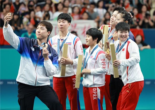 冠军中国组合王楚钦(右三)/孙颖莎(右一)、亚军朝鲜组合李正植(左二)/金琴英(左三)、季军韩国组合林钟勋(左一)/申裕斌在巴黎奥运会乒乓球混双颁奖仪式上合影(2024年7月30日摄)。新华社记者 刘续 摄