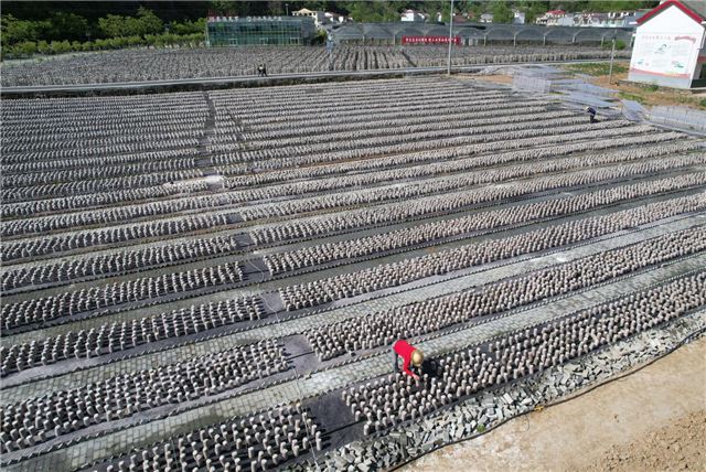 农民在柞水县小岭镇金米村查看地栽木耳长势(2022年4月21日摄,无人机照片)。新华社记者 邵瑞摄