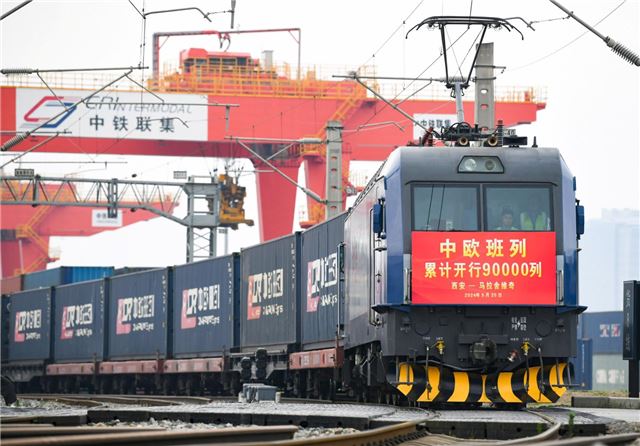 2024年5月25日,X8157次中欧班列从西安国际港站开出,驶向波兰马拉舍维奇。新华社记者 张博文摄