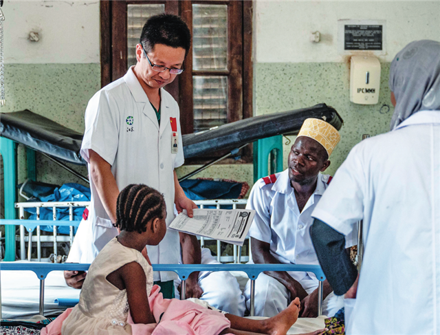 中国援桑给巴尔医疗队队长蒋国庆(左)在坦桑尼亚桑给巴尔的纳兹莫加医院查房(2023年12月29日摄)王冠森摄/本刊