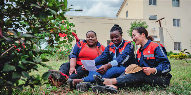 在肯尼亚内罗毕,非洲之星铁路运营公司工电部电子设备检修工区工长陈玲(右)在休息时教学员唱中文歌曲(2023年5月23日摄)王冠森摄/本刊