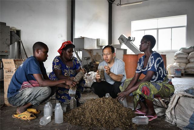 2024年8月13日,在卢旺达南方省胡耶区的中国援卢农业技术示范中心,菌草专家陈晓斌(右二)与当地农民一起制作菌种培养料。 新华社记者 韩旭 摄