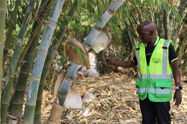 2024年8月5日,在乌干达西部姆巴拉拉市的竹子种植园,阿比·史蒂夫·图西梅在料理竹子。新华社发(罗纳德·塞坎迪摄)