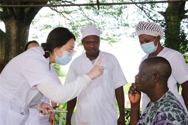 2024年6月6日,在贝宁阿波美中心医院,中国第27批援贝宁医疗队医生为当地居民筛查眼科疾病。新华社发(塞拉芬摄)