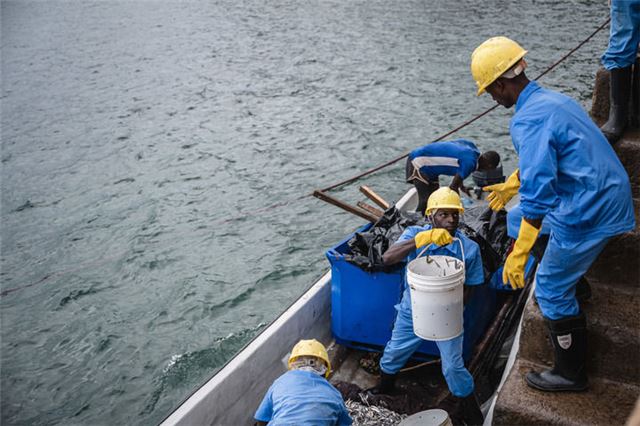 工作人员在肯尼亚夸莱郡希莫尼镇一处港口搬运新捕捞的鳀鱼(2023年6月22日摄)。新华社记者 王冠森 摄