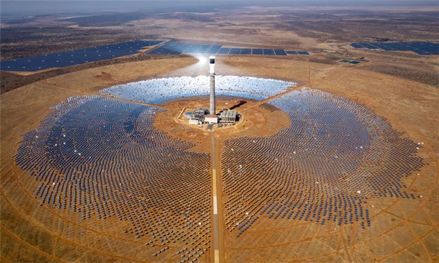 这是2024年8月20日在南非北开普省拍摄的南非红石100兆瓦塔式熔盐光热电站项目(无人机照片)。由中国电建集团山东电建三公司承建的南非红石100兆瓦塔式熔盐光热电站项目是撒哈拉以南非洲首个塔式熔盐光热电站项目,也是南非最大可再生能源投资项目之一。新华社记者 张誉东 摄
