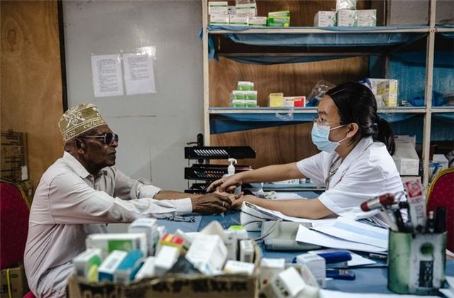 2024年1月11日,中国第15批援科摩罗医疗队队长潘春熹在位于科摩罗首都莫罗尼的马鲁夫医院内为患者看病。新华社记者 王冠森 摄