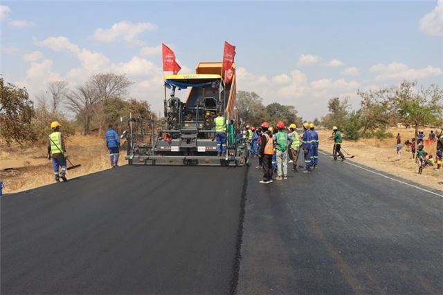 2024年8月27日,在马拉维恩科塔科塔,施工人员在卡帕滕加至本加公路升级改造项目路段铺筑沥青路面。新华社发