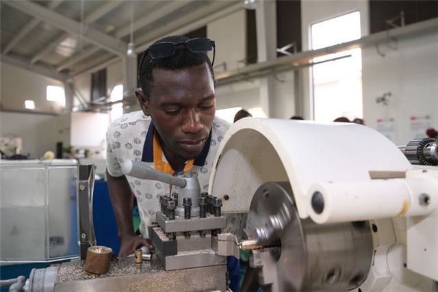 2023年1月10日,在加蓬首都利伯维尔的恩考克经济特区,恩考克国际职业教育和培训中心(由中国航空技术国际控股有限公司联合成都航空职业技术学院等院校共建)的学生进行车削加工操作训练。新华社记者 韩旭 摄