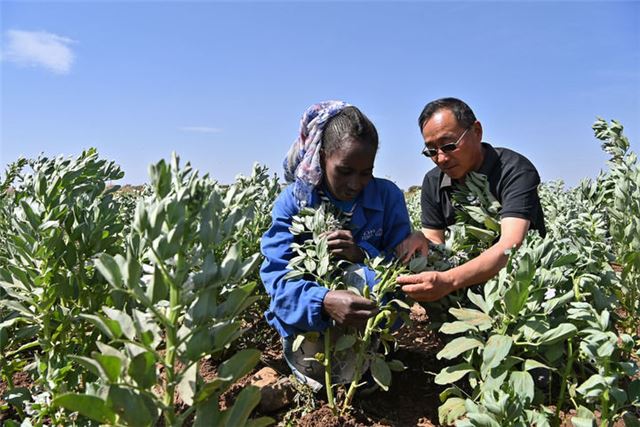 2023年9月27日,在位于厄立特里亚阿斯马拉的农业技术援助项目示范地,中国援厄第三期高级农业专家组豆类作物专家刘运民(右)指导当地农户进行蚕豆作物的田间管理。新华社记者 韩旭 摄