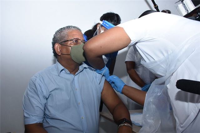 2021年1月10日,塞舌尔总统拉姆卡拉旺在位于塞首都维多利亚的一个疫苗接种点接种中国新冠疫苗。新华社发(塞舌尔《民族报》供图)