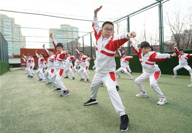 2024年2月21日,在人大附中实验小学,学生们在体育课中进行武术练习。新华社记者 任超 摄