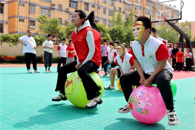 2024年5月17日,在山东省枣庄市市中区特殊教育中心,青年志愿者与智力障碍学生一起做游戏。新华社发(孙中喆摄)