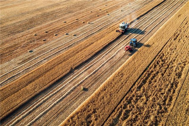 2024年5月27日,农机手驾驶农机在河南省商丘市梁园区孙福集乡崔楼村收获小麦(无人机照片)。新华社发(李恒 摄)