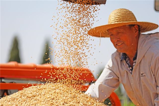 2024年5月25日,山东省临沂市郯城县郯城街道山南头村村民将收获的小麦装车。新华社发(张春雷 摄)