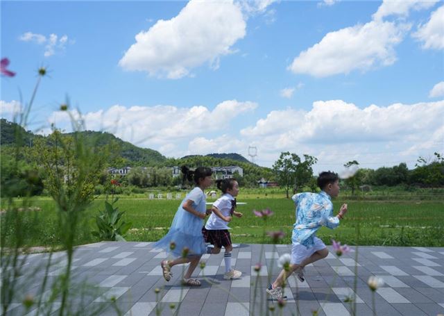 儿童在余姚市梁弄镇的田野间奔跑(7月3日摄)。新华社记者翁忻旸 摄