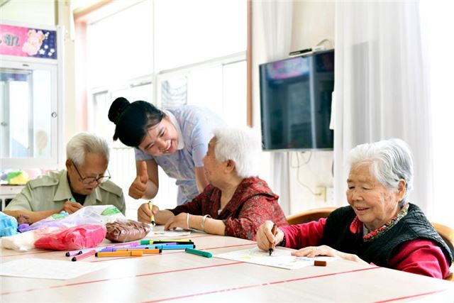 2024年5月25日,在山东省日照市东港区石臼街道日照幸福护理院,老人在工作人员的陪护下做填图游戏。新华社记者 郭绪雷 摄