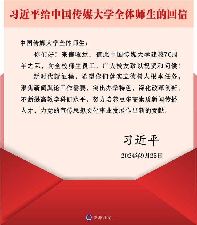 中共中央总书记、国家主席、中央军委主席习近平给中国传媒大学全体师生回信,在中国传媒大学建校70周年之际,向全校师生员工、广大校友致以祝贺和问候 回信全文