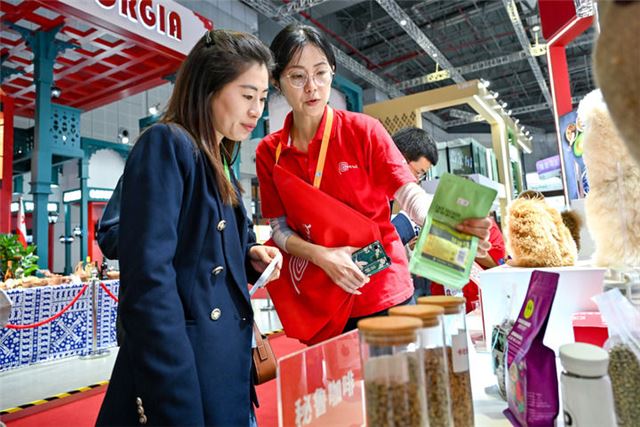 11月7日,一名观众(左一)在第七届进博会国家展秘鲁馆了解秘鲁咖啡。新华社记者 张铖 摄