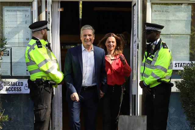 2022年5月5日,英国工党领袖斯塔默(左二)与妻子(右二)在伦敦一家投票站投票后准备离开。新华社发(蒂姆·爱尔兰摄)