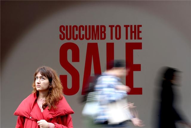 2023年12月26日,在英国伦敦牛津街,一名女子站在促销广告牌前。新华社记者李颖摄